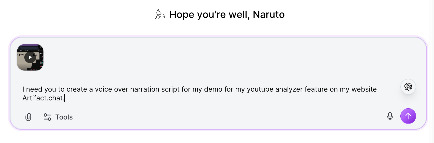 Begin by uploading your video file to Artifact. The platform supports various video formats and can process content of different lengths. Once uploaded, you can craft a prompt that guides the AI in understanding your content and desired narration style.