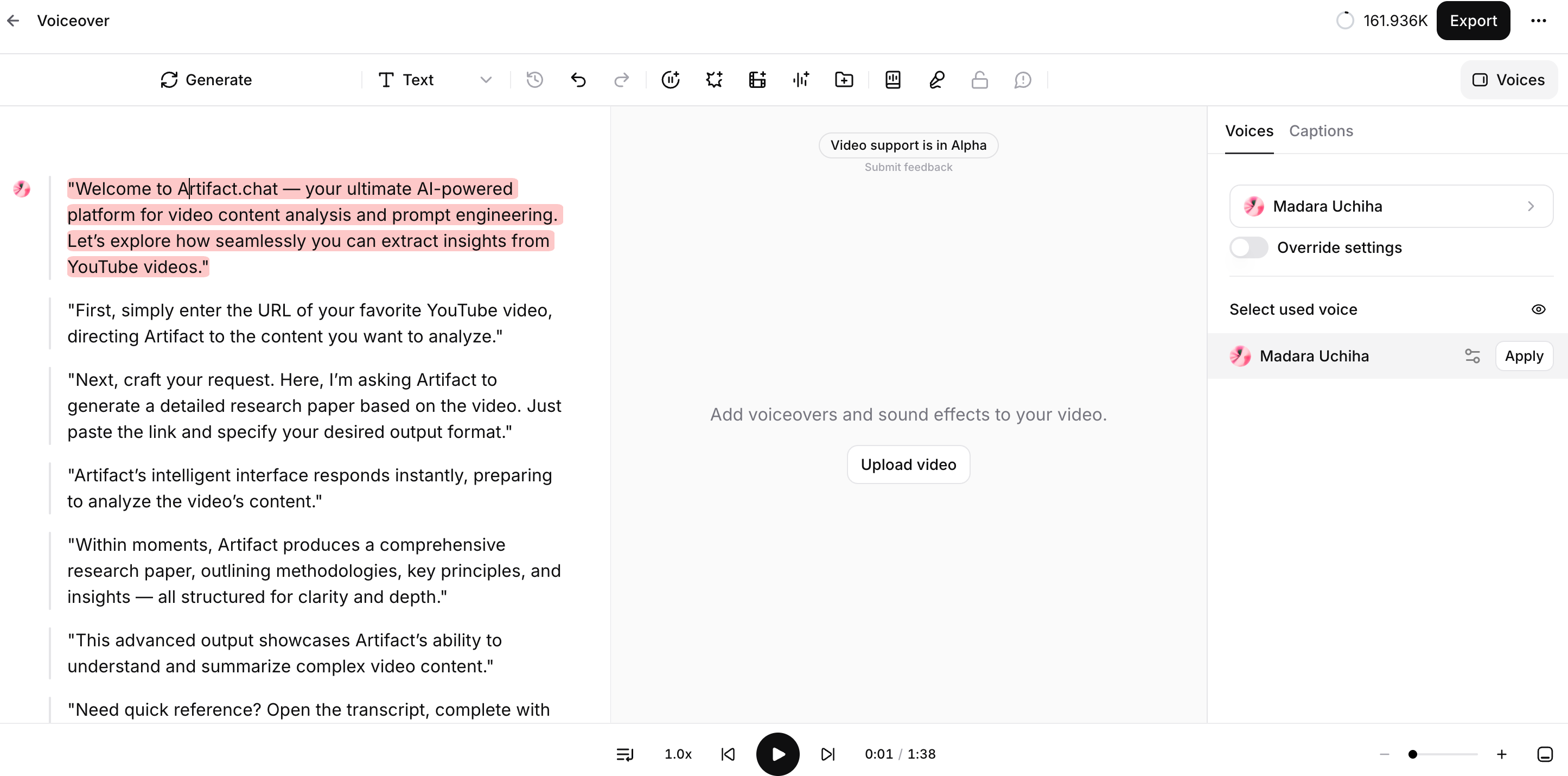 After processing your video, Artifact's advanced AI analyzes the visual content, identifies key moments, and generates a comprehensive narration script. This script is tailored to match your prompt requirements and flows naturally with the video's pacing.