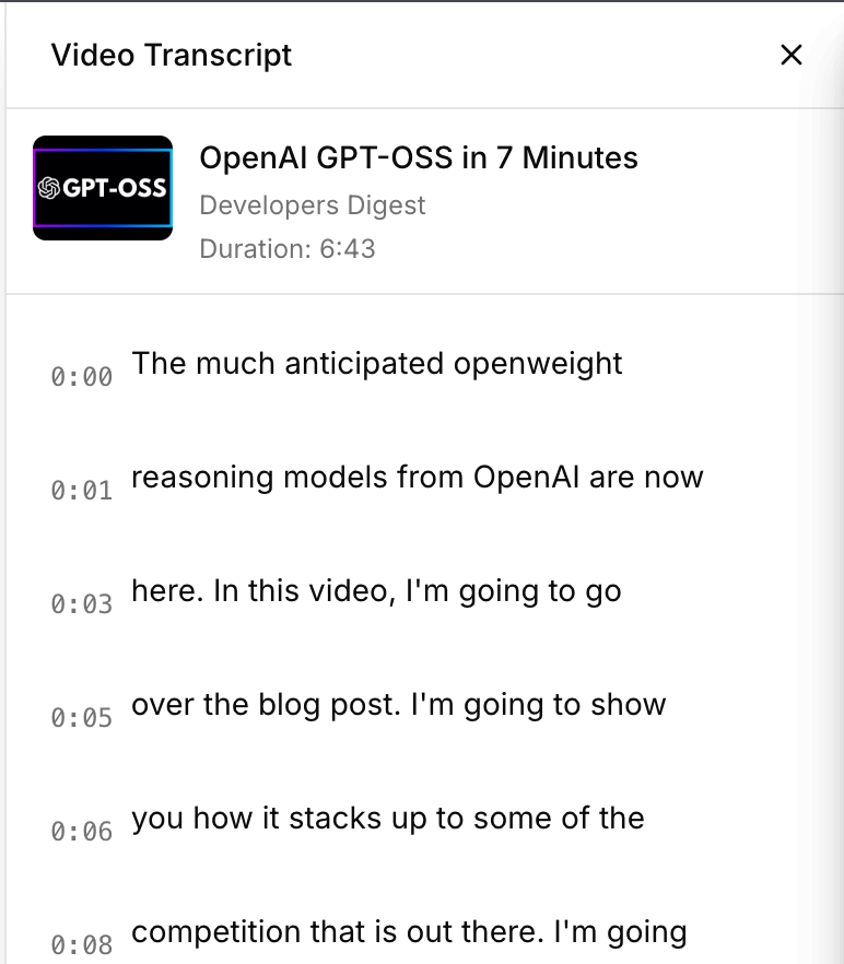 This sidebar interface makes it incredibly easy to work with transcript data - whether you're taking notes, creating content summaries, or extracting specific quotes for research purposes.